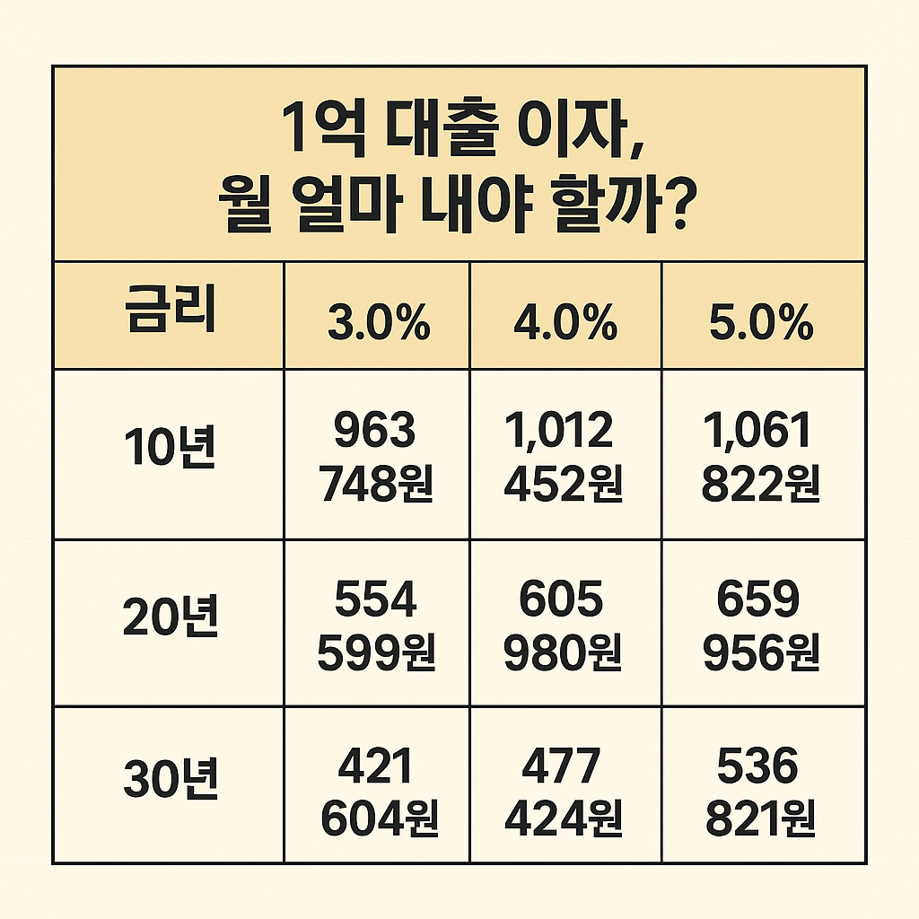 - 1억 원 대출 시 금리 5%면 월 42만 원 수준