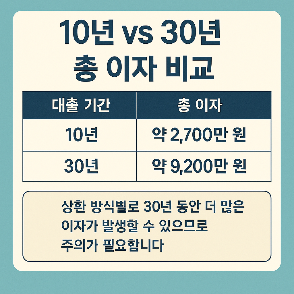 👉 즉, “총 이자 비용 절감”을 원한다면 10년 상환, “월 부담 완화”가 목적이라면 30년 상환이 적합합니다.