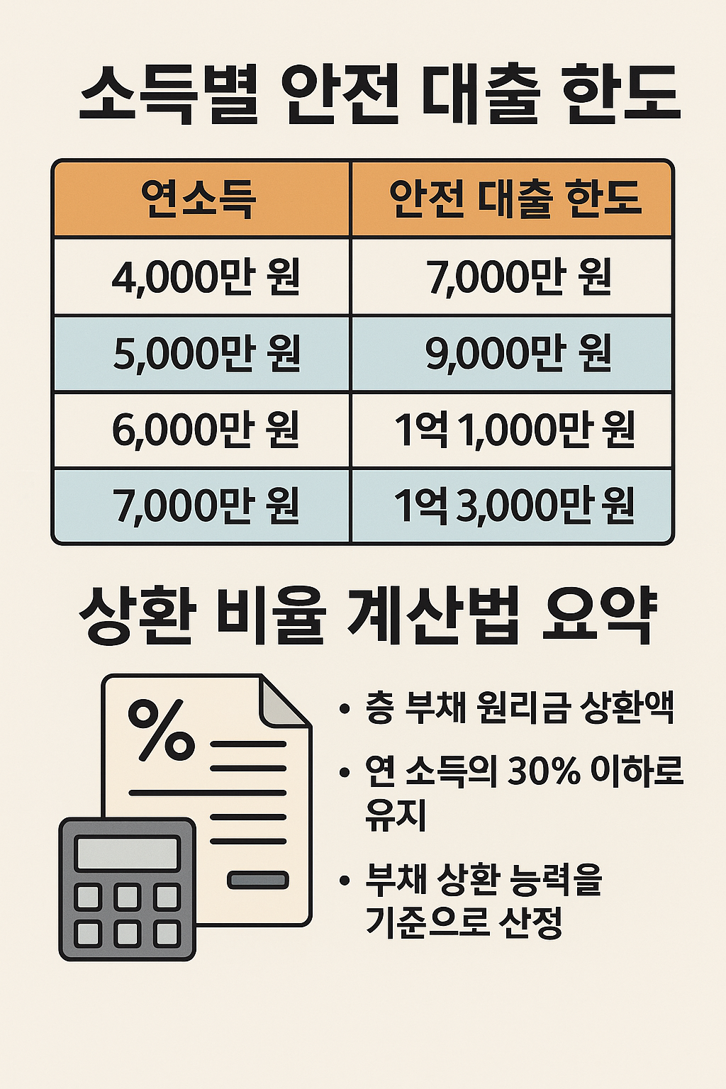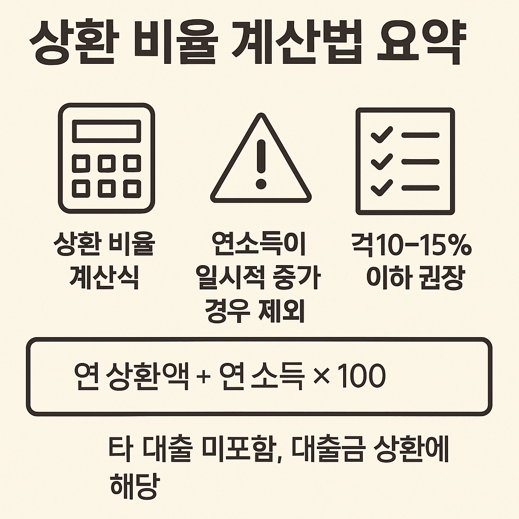 👉 즉, 연소득 5천만 원이라면 연간 원리금 상환액이 2천만 원 이하일 때만 ‘안전한 대출 범위’로 볼 수 있습니다.