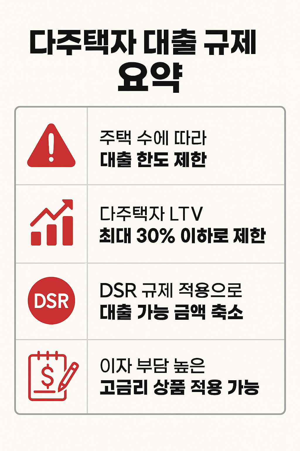 정부는 가계부채 관리와 부동산 투기 억제를 위해 다주택자 대출을 강력하게 제한하고 있습니다. 주요 규제는 다음과 같습니다.