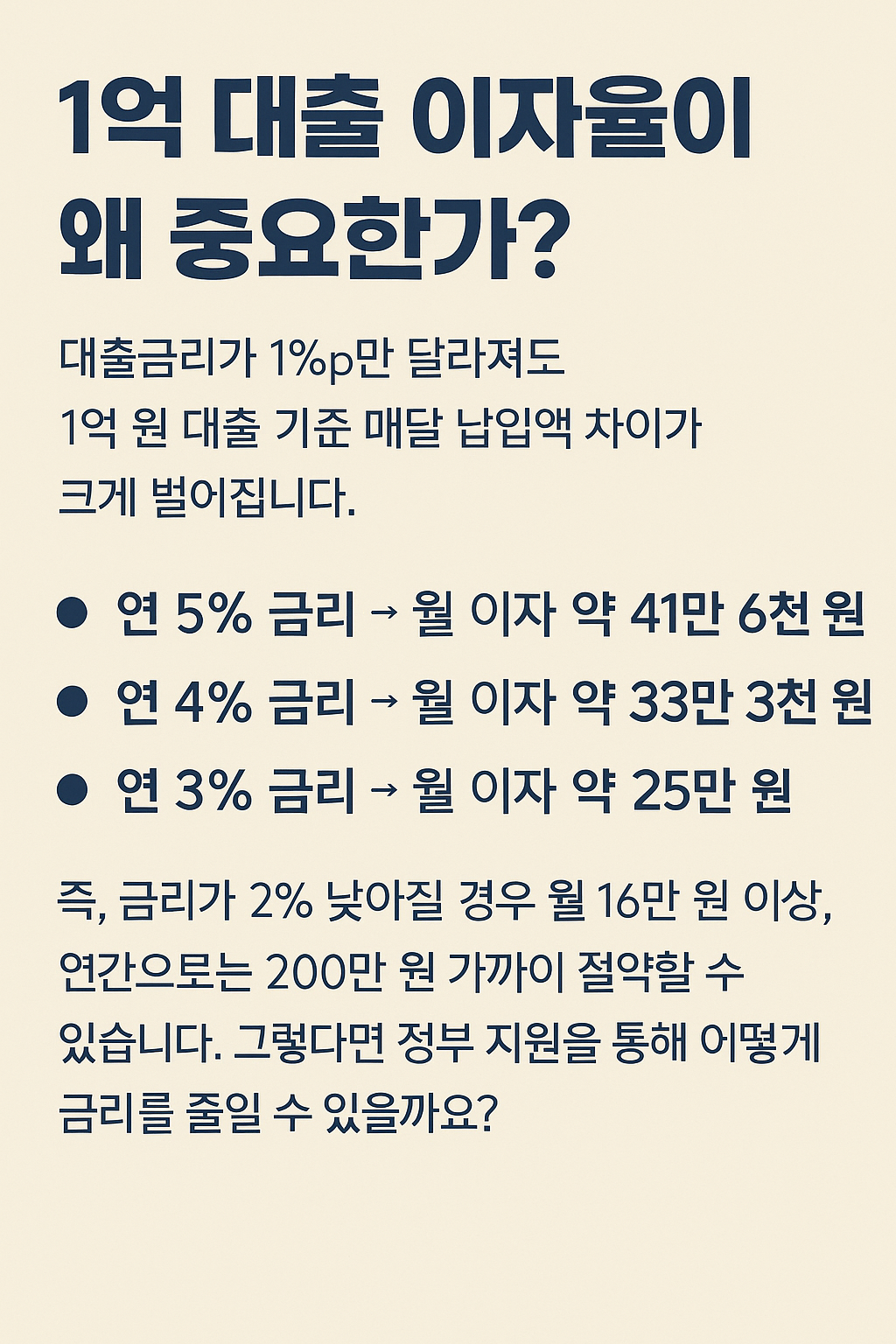 대출을 받을 때 가장 중요한 것은 바로 이자율입니다. 특히 1억 원 규모의 대출은 금리 차이만으로도 월 납입액이 수십만 원씩 달라질 수 있기 때문에, 어떻게 하면 이자율을 낮출 수 있을지 고민하는 분들이 많습니다. 단순히 은행 상품만 비교하는 것에서 나아가, 정부지원금과 정책금융상품을 활용하면 효과적으로 부담을 줄일 수 있습니다. 오늘은 1억 대출 이자율을 낮추는 구체적인 방법과 직장인·서민층이 활용할 수 있는 정부지원 제도를 소개하겠습니다.