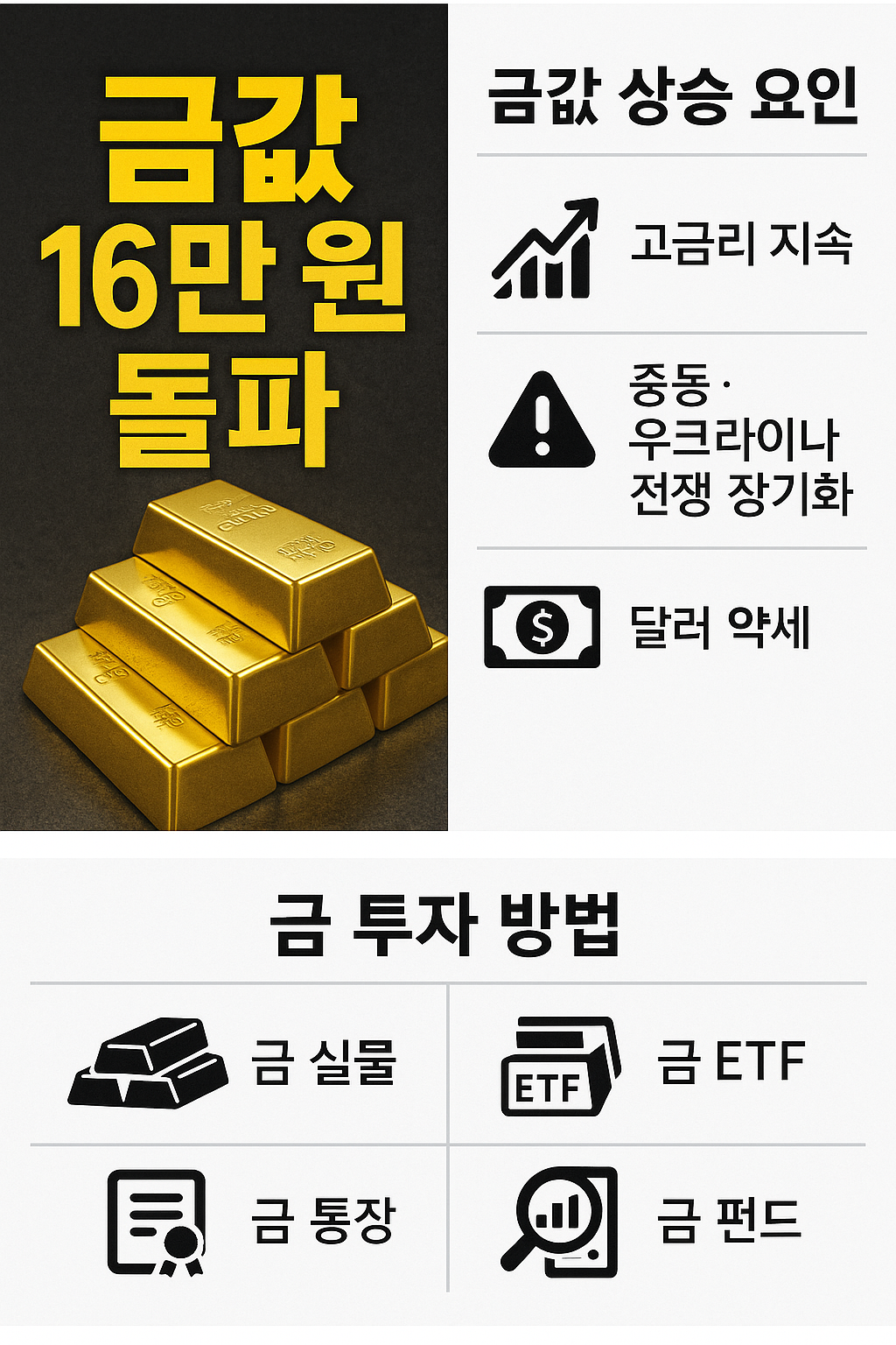 2025년 현재, 국내 금값이 1g당 16만 원을 기록하며 또다시 최고치를 경신했습니다. 이는 불과 몇 년 전 7만~8만 원대에 머물렀던 시세와 비교했을 때 두 배 가까이 상승한 수치입니다. 투자자들 사이에서는 “지금이라도 금 투자에 뛰어들어야 할까?”라는 고민이 커지고 있습니다.