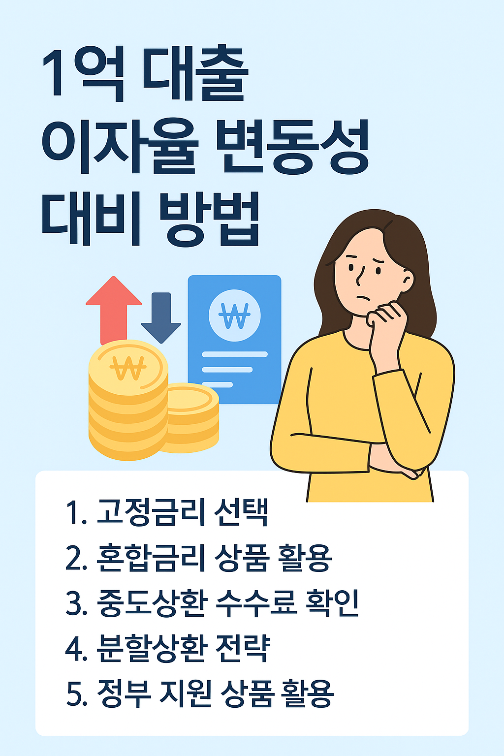 1억 대출은 금액이 크기 때문에, 이자율 변동에 따라 수천만 원의 차이가 발생할 수 있습니다. 따라서 대출 상품을 고를 때는 금리뿐 아니라 변동성에 대비할 수 있는 조건을 함께 고려해야 합니다.
