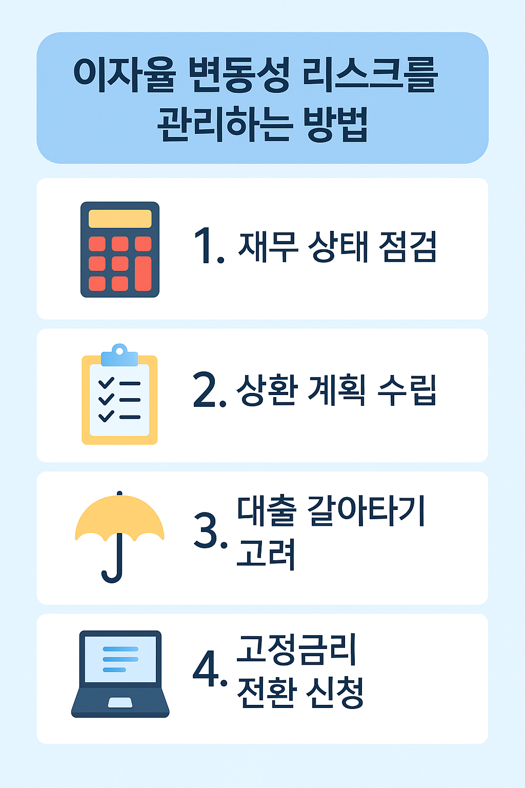 일부 기간은 고정금리, 이후는 변동금리를 적용하는 상품을 활용하면 리스크를 줄일 수 있습니다. - 중도상환 수수료 확인