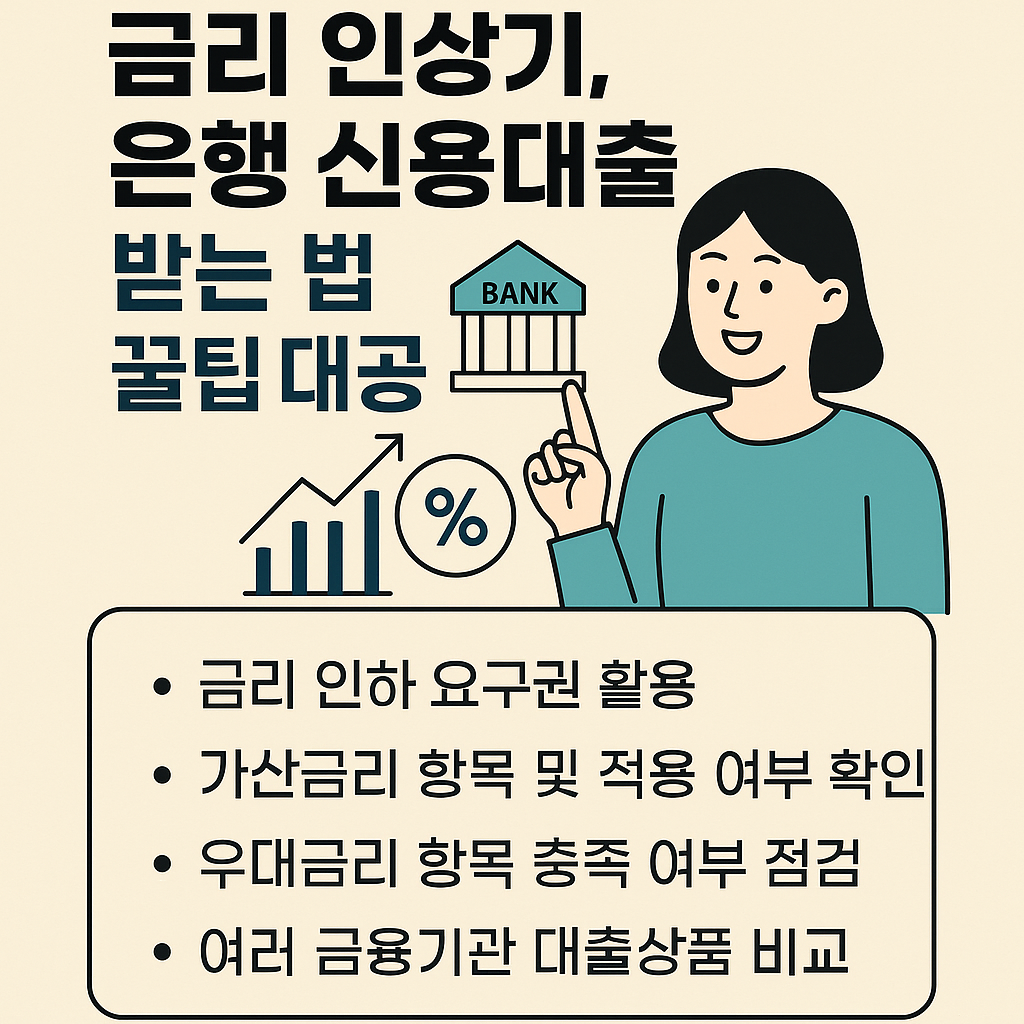 최근 시중은행의 신용대출 금리가 연이어 오르면서 대출을 고민하는 분들의 부담이 점점 커지고 있습니다. 하지만 당장 자금이 필요한 상황에서는 금리가 높아도 대출을 고려할 수밖에 없는 경우가 많죠. 그렇다면 금리 인상기에도 현명하게 은행 신용대출을 받는 방법은 무엇일까요? 이번 글에서는 실질적으로 도움이 될 수 있는 꿀팁을 정리했습니다.